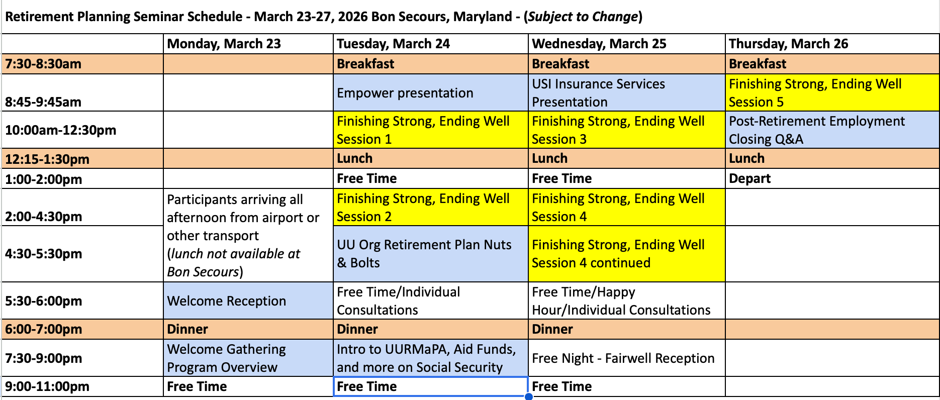 📣 We are excited to announce the 2026 Retirement Planning Seminar: An Interactive Retreat for UU Professionals including Ministers, Religious Educators, and Other Professionals Planning to Retire in the Next Ten Years.Â