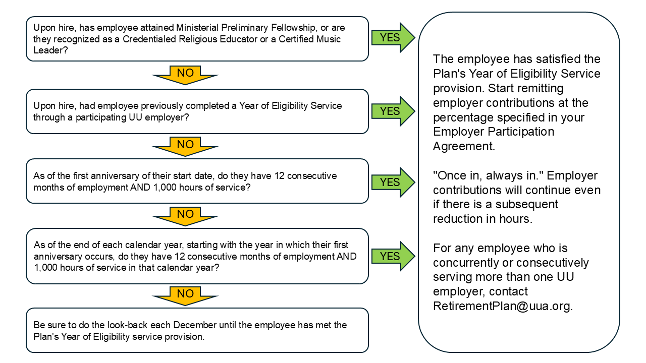All employees, regardless of the number of hours they work or status/title you give them are eligible to participate in the Plan from their first day of employment to make employEE contributions via payroll deduction and must be given the opportunity to do so. All employees must be enrolled in the Plan. Some employees may also satisfy the Year of Eligibility Service (YOES) and must receive the employER contribution as elected on the organization's Employer Participation Agreement (EPA).