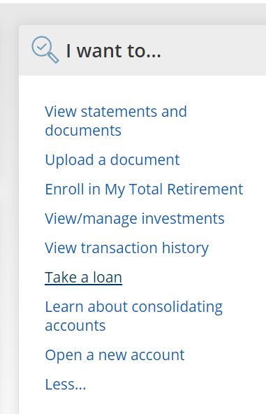 To start a loan request, you can call Empower and speak to a representative, or log into your account. When logged in, on the right side under I want to, click on More, and then on Take a loan (picture below).