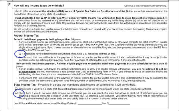 To request no federal and no state taxes to be withheld for periodic installment payments, please complete part F by checking the boxes circled below.