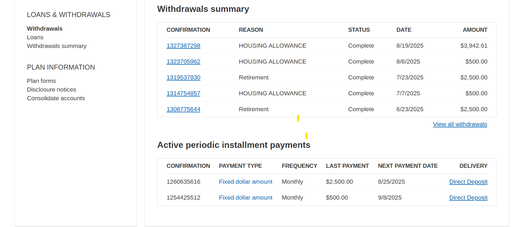 Then scroll down to see a list of withdrawals, both prior (withdrawals summary) and scheduled (active periodic installment payments).