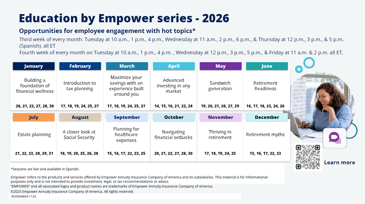 The May 2025 webinar covers the Empower dashboard and financial tools you can use: A financial experience focused on you / Una experiencia financiera centrada en usted.
