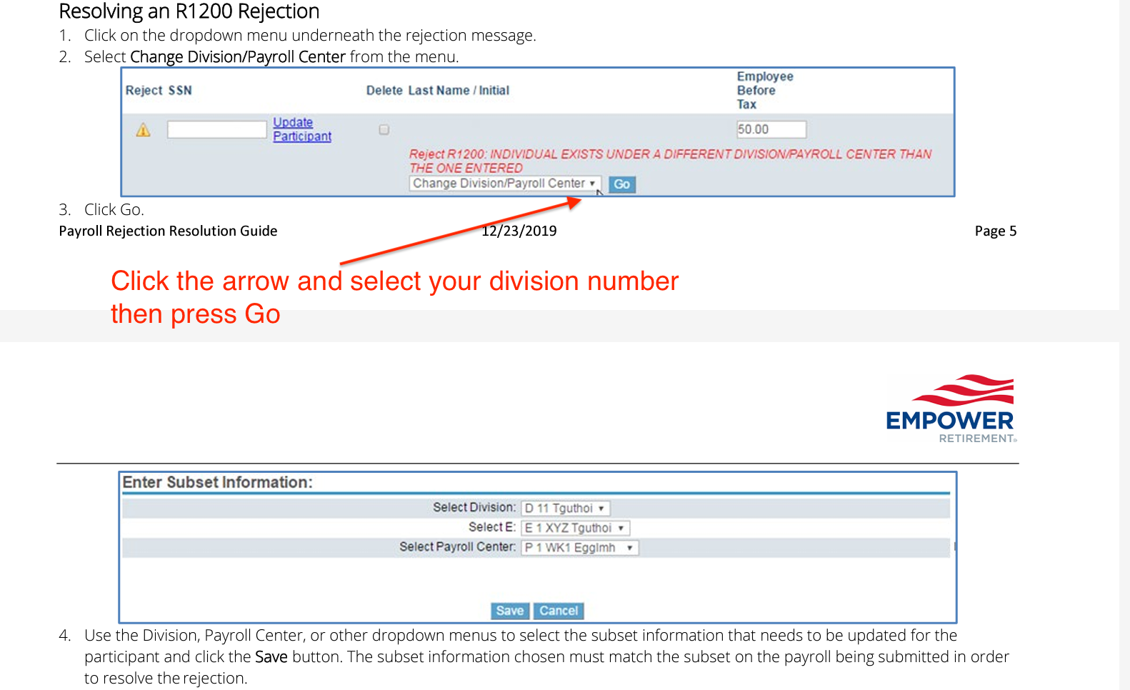 Please follow the steps outlined in the Rejection Error to select your division number and clear the error to proceed. To mass clear, select “View All Rejects/Mass Clear”, select all, then “Change Division/Payroll Center”